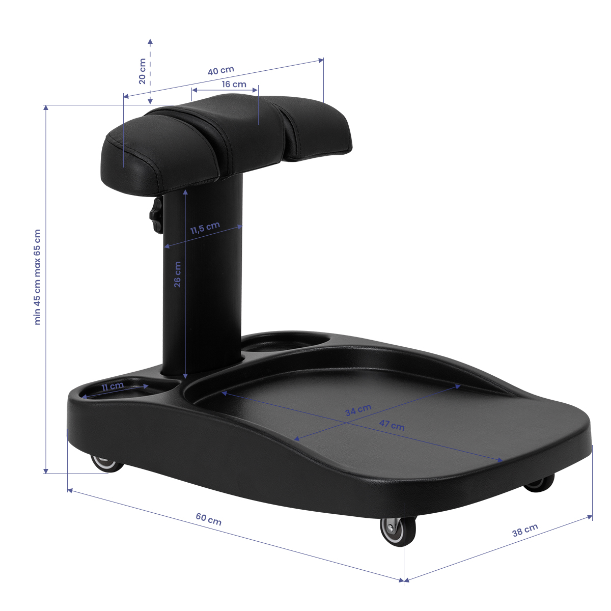 Il poggiapiedi è composto da tre parti, di cui quella centrale è estensibile. La regolazione manuale dell’altezza consente di alzarlo di un massimo di 20 cm. Tutti gli elementi del poggiapiedi sono rivestiti in pelle sintetica, che garantisce resistenza all’umidità e facilità di pulizia. Di conseguenza, il carrello può essere adattato alle esigenze individuali dell’utente, il che lo rende un’ottima soluzione sia per i trattamenti estetici che per quelli podologici, garantendo comfort e precisione di lavoro in diverse posizioni.