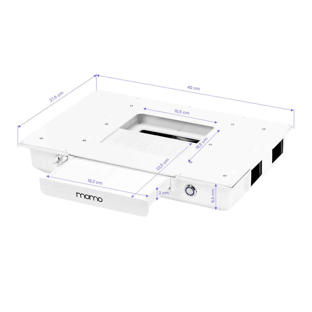 L’aspiratore di polvere a cassetta Momo J-02 integrato nel piano di lavoro migliora significativamente il comfort e l’igiene del lavoro, rimuovendo efficacemente la polvere generata durante i trattamenti estetici, come la manicure. Grazie a questo dispositivo, l’aria nel salone rimane pulita e l’ambiente di lavoro privo di inquinamento, il che aumenta la sicurezza sia dell’estetista che dei clienti. L’aspiratore di polvere è facile da usare e da manutenere, il che ne migliora ulteriormente la funzionalità. La pulizia regolare e la sostituzione del filtro garantiscono un’efficienza di assorbimento costantemente elevata. È possibile acquistare filtri di ricambio aggiuntivi (SKU 123581).