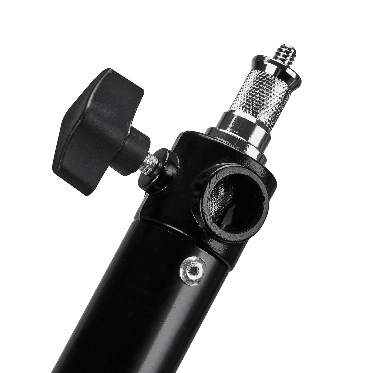 Il design telescopico consente di regolare la lunghezza del braccio da 73 a 131 cm. La regolazione dell’angolazione del treppiede offre una notevole libertà di movimento in verticale e in orizzontale, consentendo di orientare l’illuminazione con precisione nella direzione selezionata. Il perno bifacciale può essere montato in uno dei tre fori, il che consente diselezionare l’impostazione di illuminazione più adatta alle proprie esigenze.