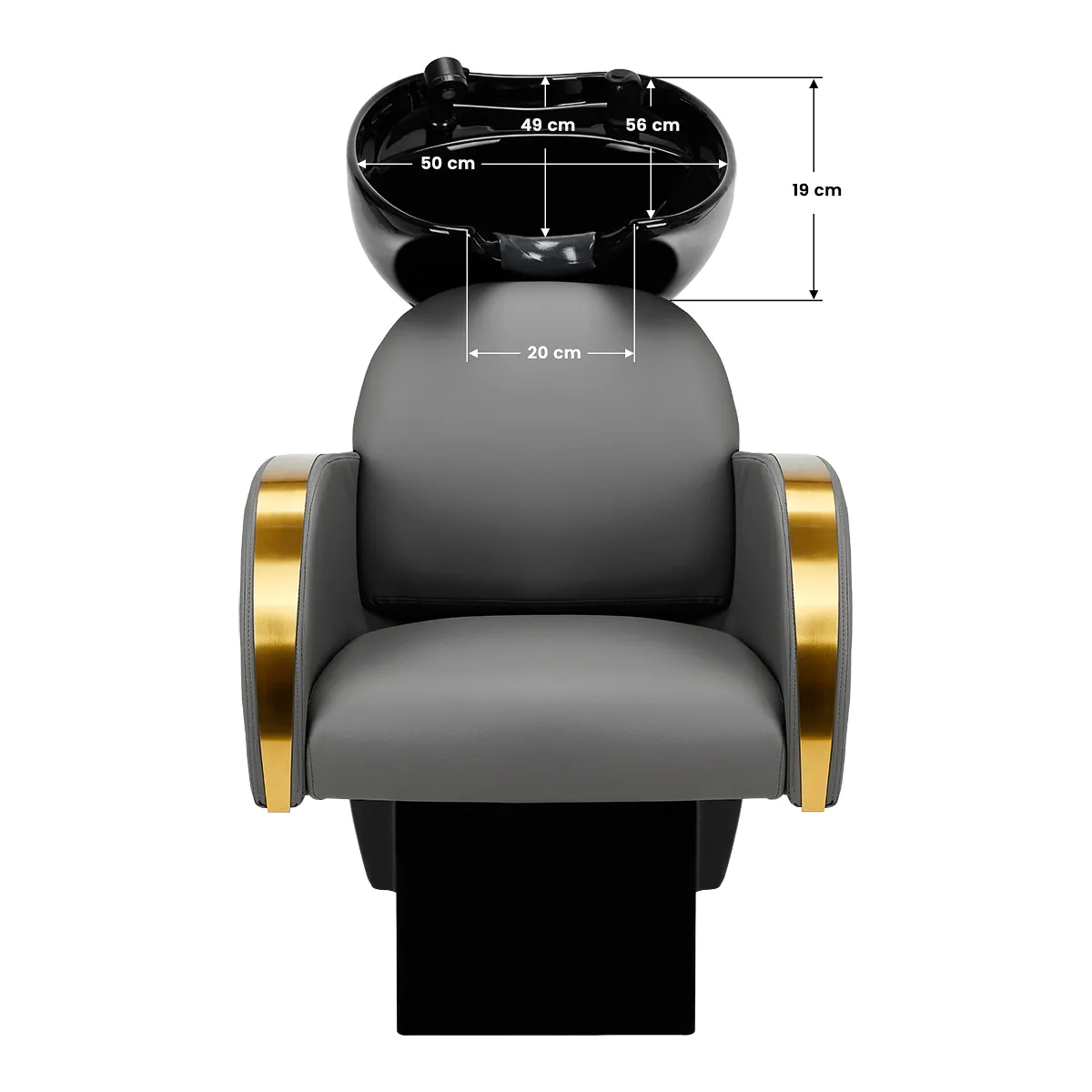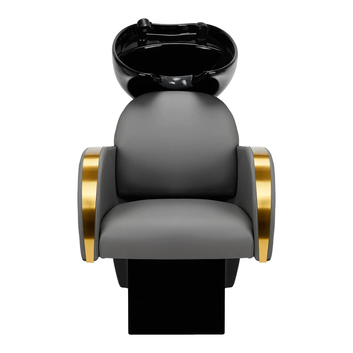 Una poltrona adeguatamente profilata, imbottita in schiuma resistente, garantisce un elevato comfort d’uso e gli eleganti braccioli consentono il corretto posizionamento delle spalle del cliente. Lo schienale è posizionato con un’angolazione ottimale per consentire di assumere la posizione corretta e favorire un eccellente supporto della colonna vertebrale. Il rivestimento in tonalità di grigio e le superfici metalliche decorative laccate in oro conferiscono un’eleganza senza tempo e garantiscono inoltre una lunga durata e una facile pulizia. La caratteristica finitura classica del lavatesta lo rende perfetto per quasi ogni ambiente. Il set include accessori completi in tonalità di nero, tra cui rubinetto, soffione doccia e tubi dedicati, per fornire un set completo di strumenti di lavoro.