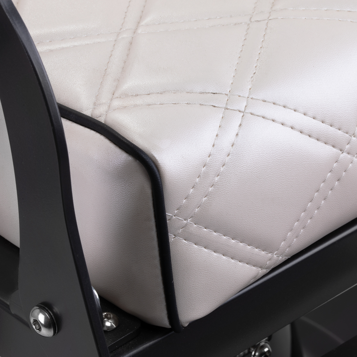La solida base garantisce stabilità e un elevato comfort d’uso. L’imbottitura del sedile in schiuma antideformazione e il rivestimento in similpelle piacevole al tatto con finitura perlata garantiscono durata e comfort d’uso a lungo. Questi materiali sono resistenti all’umidità, durevoli e facili da pulire. La tonalità crema del rivestimento conferisce alla poltrona un carattere unico e il suo stile elegante si integra perfettamente con l’arredamento da barbiere.