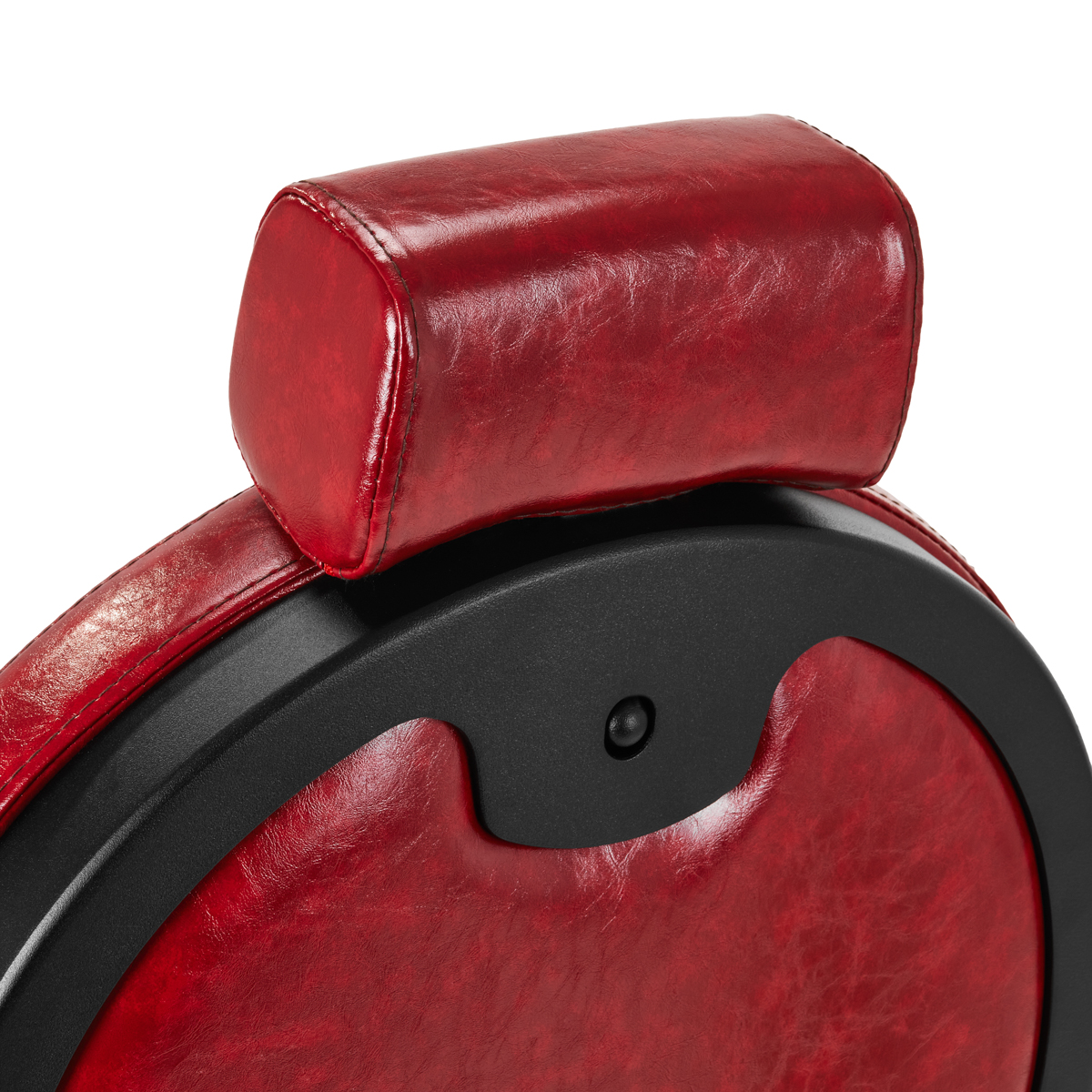 La solida struttura della base garantisce stabilità e un elevato comfort d’uso. L’imbottitura della seduta è realizzata in schiuma resistente e indeformabile, mentre il rivestimento è in similpelle piacevole al tatto con finitura lucida, garantendo la durevolezza del mobile e il suo comfort d’uso a lungo. Inoltre, rendono l’arredamento resistente all’umidità, durevole e facile da pulire. Il rivestimento nei toni del rosso, con trapuntatura e bottoni decorativi, gli conferisce un carattere unico. La sedia dal design caratteristico, che richiama lo stile vintage, si adatta perfettamente all’atmosfera dei barbieri, sottolineandone l’atmosfera unica.