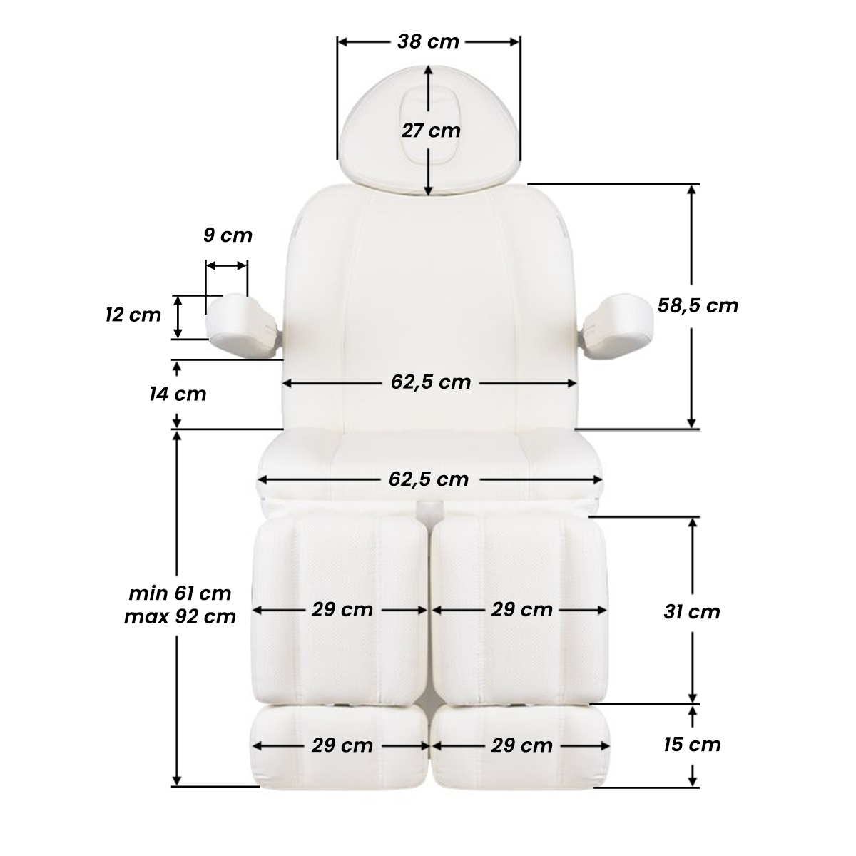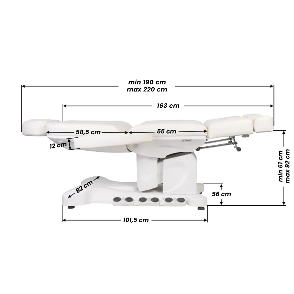 Una poltrona elettrica per estetica unica nel suo genere, ideale per centri estetici e SPA. Grazie ad attuatori indipendenti, consente di regolare la poltrona su 3 livelli tramite telecomando e pedali, offrendo la possibilità di effettuare trattamenti pedicure e trattamenti viso e corpo in tutta comodità. Utilizzando il telecomando, è possibile utilizzare le impostazioni programmate e avviare la funzione HOT, ovvero il riscaldamento. La poltrona è dotata di un rivestimento traforato, inedito per altre poltrone, e di un’illuminazione LED colorata della base.