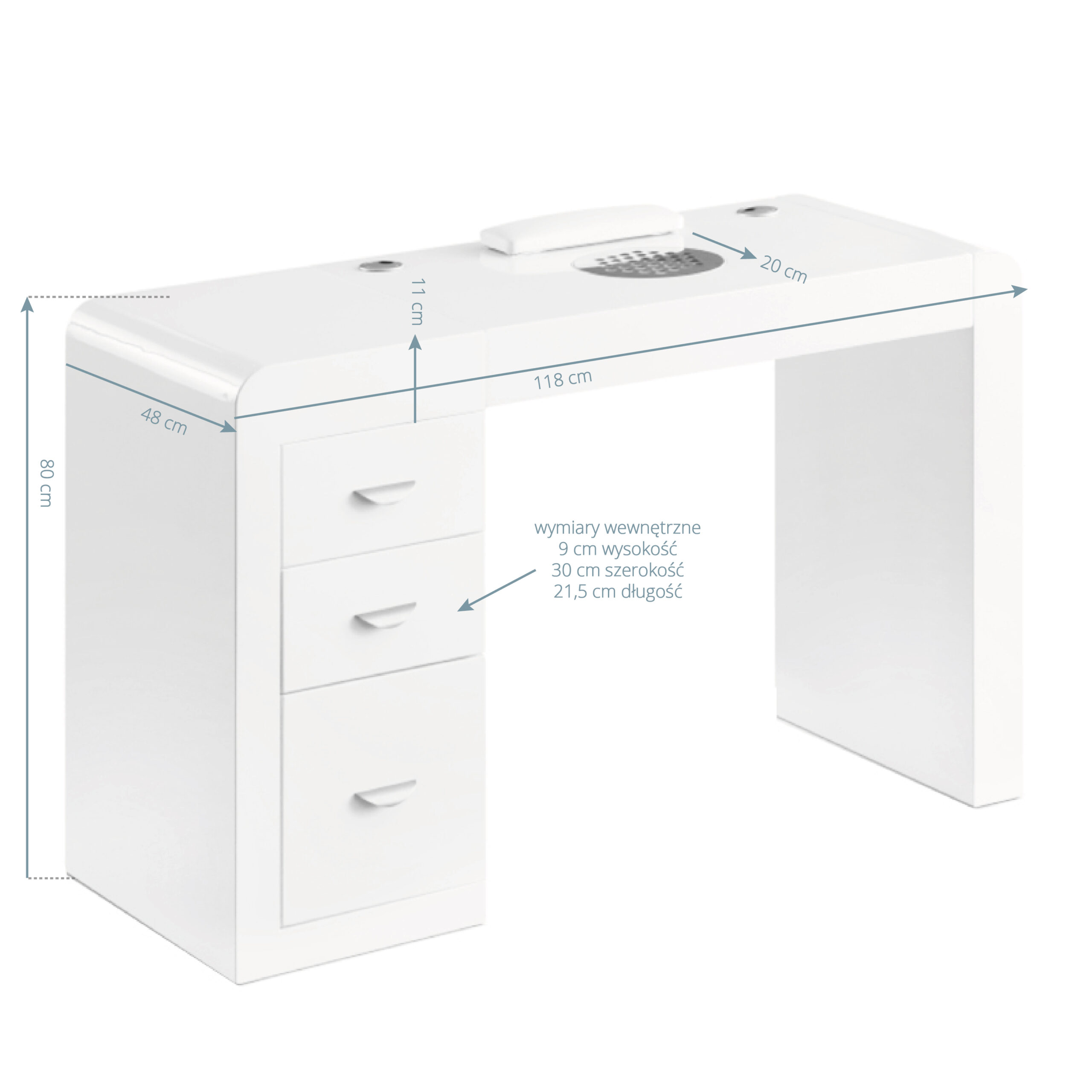 Tre ampi cassetti facilitano l’organizzazione e la conservazione in ordine di cosmetici e strumenti essenziali. La scrivania è dotata di un pratico assorbitore che riduce efficacemente la quantità di polvere nociva, garantendo aria pulita e fresca nell’ambiente di lavoro. Allo stesso tempo, grazie alla sua integrazione nel piano del tavolo, non occupa spazio prezioso. Gli spazi appositamente progettati per i cavi rendono più facile organizzare i dispositivi necessari nel salone, come frese per unghie, lampade per trattamenti o lampade per unghie, consentendo di nascondere i cavi.