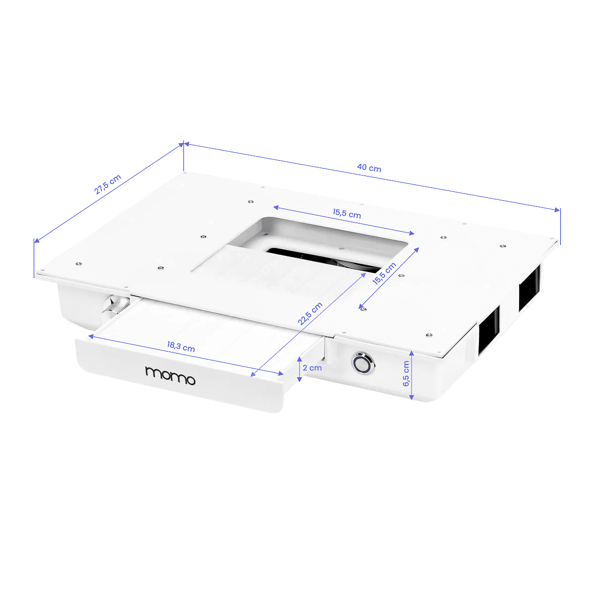 L’assorbitore di polvere Momo J-02 c, integrato nel piano di lavoro, migliora significativamente il comfort e l’igiene, rimuovendo efficacemente la polvere generata durante i trattamenti estetici come la manicure. Con questo dispositivo, l’aria nel salone rimane pulita e l’area di lavoro rimane priva di contaminazioni, aumentando la sicurezza sia per l’estetista che per i clienti. L’assorbitore di polvere è facile da usare e manutenere, migliorandone ulteriormente la funzionalità. La pulizia regolare e la sostituzione del filtro garantiscono un’efficienza di assorbimento costantemente elevata. È possibile acquistare filtri di ricambio aggiuntivi (SKU 123581).