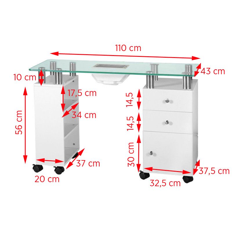 è un mobile non solo funzionale, ma anche estremamente elegante, che si abbina perfettamente all’arredamento di ambienti moderni. oltre a tre ripiani aperti, è dotato di un mobiletto e due ampi cassetti, e di un aspirapolvere. grazie a ben otto ruote, il mobile è stabile e facile da spostare negli ambienti, anche quando è carico. un rialzo di diversi centimetri sotto il piano del tavolo in vetro temperato spesso rende il tavolo proposto perfetto per i trattamenti di manicure.